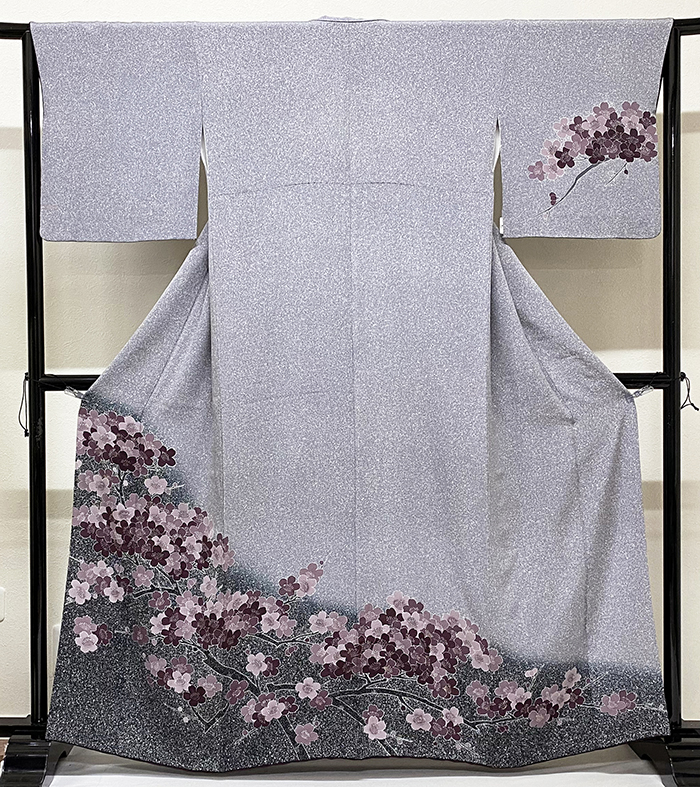 しなやかな手触りの上質な変わり一越の生地をグレーに白のロウ吹雪を重ねて地染めし、上前からの黒の裾暈しと、枝花の柄を赤紫色濃淡で重ね染めした品。八掛けは正絹小豆色無地で胴裏は正絹が付いた手縫い仕立て。八掛けの上前オクミに作家名と落款があります。