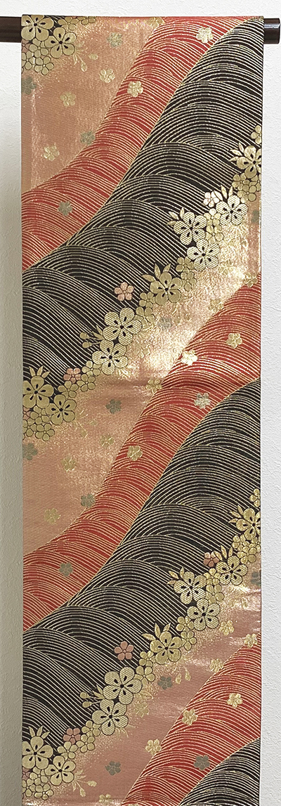 薄手で張りのある手触りの錦織りで、金糸を重ねた黒の地織りに、波と花などの柄を黒やエンジ色にローズ色に金糸金箔を加え重ね織りした品。