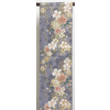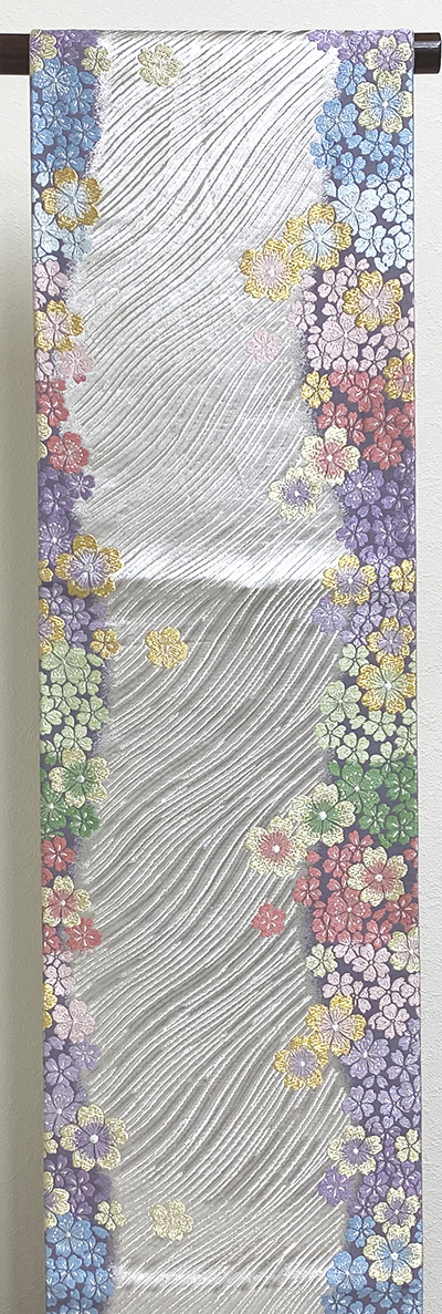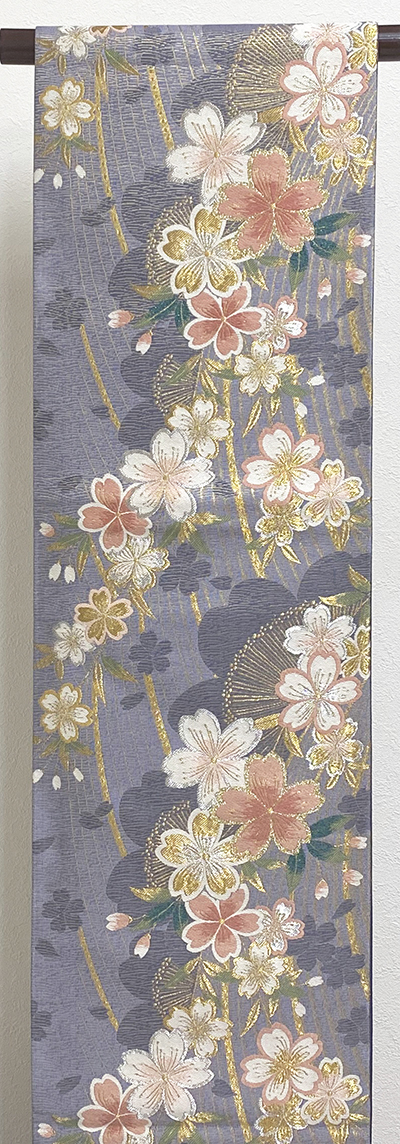 しなやかでやわらかな手触りの錦織りで、淡い青紫色に金糸を重ねた地織りに、枝垂れ桜などの柄を珊瑚色や白ネズ色・緑色・金糸金箔を加え重ね織りした品。