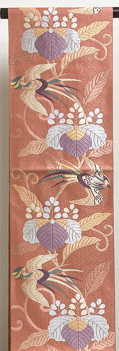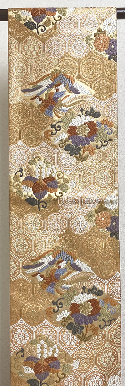 しなやかな張りのある手触りの上質な錦織りで、淡いオレンジ色に金糸を重ねた地織りに、亀甲華紋柄を白やベージュ色で織り、鳳凰や花などの柄を青紫色やエンジ色・ウグイス色などの唐織りで重ね織りした品。