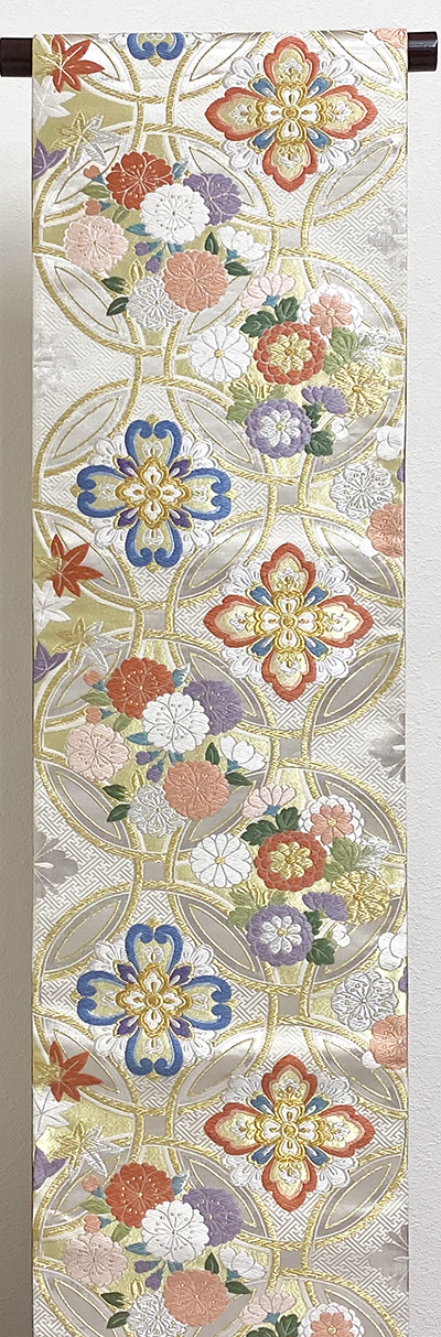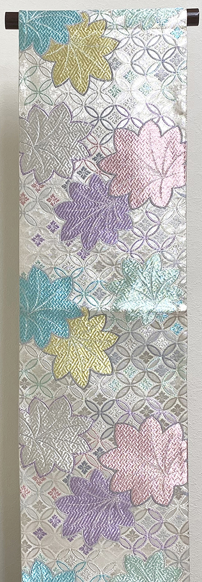 確りとした張りのある手触りの錦織りで、生成りに銀のサヤガタを織り込んだ地織りに、七宝柄を銀糸銀箔で織り、大きな楓の柄を薄紫色や珊瑚色・緑色などで重ね織りした品。