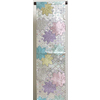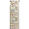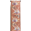 張りのある手触りで確りと打ち込まれた錦織りで、生成りに銀のサヤガタを織り込んだ地織りに、七宝華紋や花柄を薄ピンク色や藤ネズ色・ブルーグレー色くすんだオレンジ色・金糸などの唐織りで重ね織りした品。