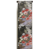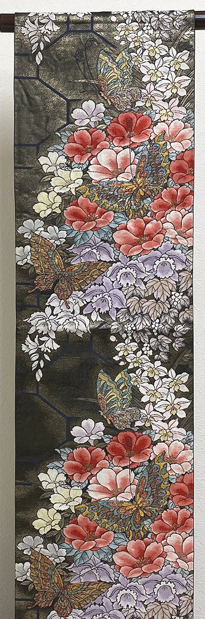 張りのある手触りの錦織りで、黒に蜀江の地柄を金糸で重ねた地織りに、花や蝶の柄を赤色濃淡や青緑色・辛子色などに、金の焼き箔やラメ箔などを加え重ね織りした品。