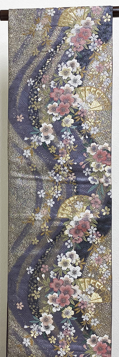 しなやかな手触りの錦織りで、波の地柄をフクレ織りで重ねた藤ネズ色の地織りに、流水や檜扇に枝垂れ桜などの柄を金糸金箔や白・黄緑色・退紅色などで重ね織りした品。