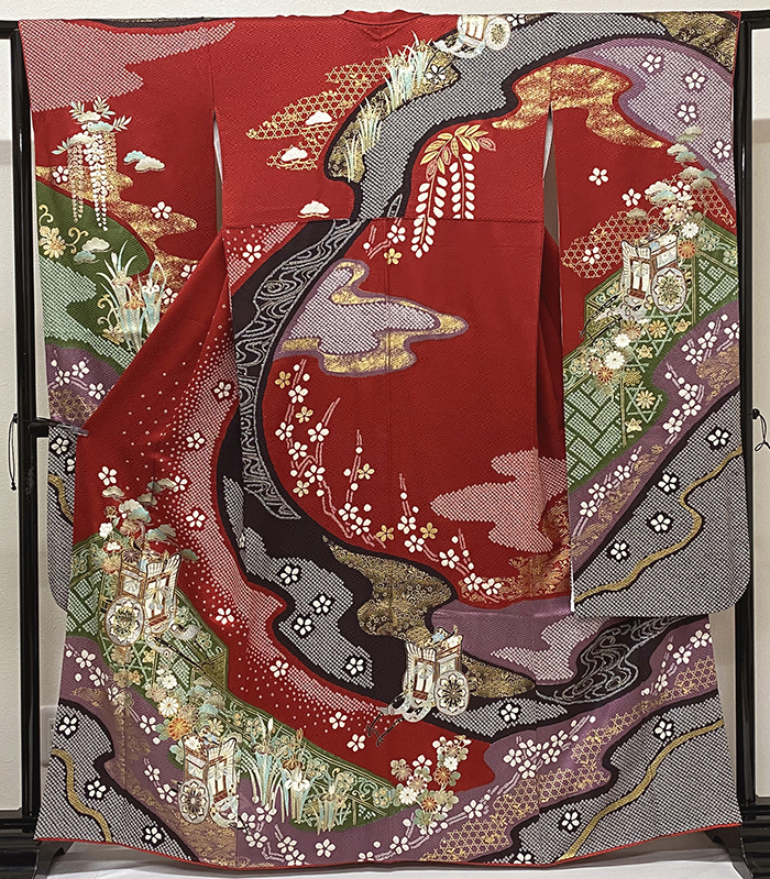 確りとした良い手触りのサヤガタの地柄を織り込んだ紋意匠の生地を深いエンジ色に地染めし、上前からの流水取り花や御所車などの柄を白の鹿の子絞りや、青色や緑色・紫色・エンジ色などに銀彩や糸金彩・盛り金彩を加え重ね染めした品。八掛けは正絹エンジ色無地でオクミ裏に柄を置き胴裏は正絹が付いた手縫い仕立て。衿裏にはホック代わりに糸が付いています。パールトーン加工済み、下前衿先裏にタグがあります。