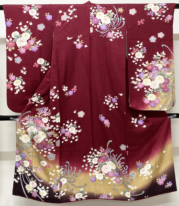 しなやかな良い手触りの小さな霜降り柄を織り込んだ紋意匠の生地を深いエンジ色に地染めし、金茶色とこげ茶色の裾暈しと、上前からの花柄を生成りと赤紫色・薄緑色などに、金銀糸と白や玉虫糸などの手刺繡を加え重ね染めした品。八掛けは正絹エンジ色無地が付き胴裏は正絹が付いています。手縫いのバチ衿仕立て。