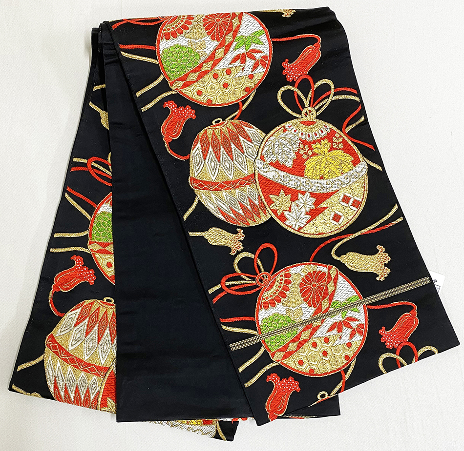 しなやかな手触りの錦織りで、黒の地織りに、大きな鈴と紐の柄をエンジ色に緑色・金銀糸などで重ね織りした品。