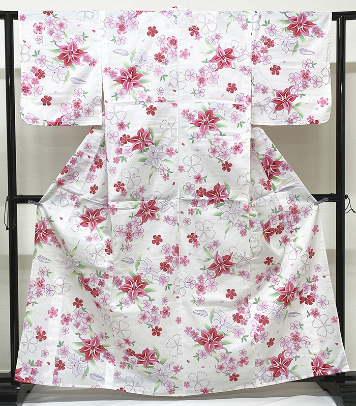確りとした張りのある手触りの綿紅梅の生地を白に地染めし、花柄を赤紫色に薄緑色などで重ね染めし、縁取りを赤いラメ箔で仕上げた品。背伏せは共生地返しで単衣仕立て。ミシン縫い仕立て。