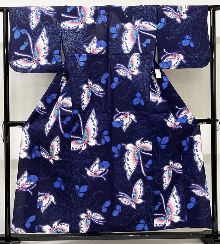 確りとした手触りの木綿の生地を黒に近い紺色に地染めし、蝶と花の柄を白に赤紫色などと、緑色や銀のラメ箔を加え重ね染めした品。背伏せは共生地返しで単衣仕立て。手縫い仕立て。