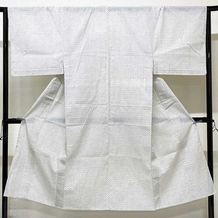 しなやかな手触りの木綿の生地を白に地染めし、絣柄を墨色で重ね染めした品。背伏せは別生地が付いた単衣仕立て。