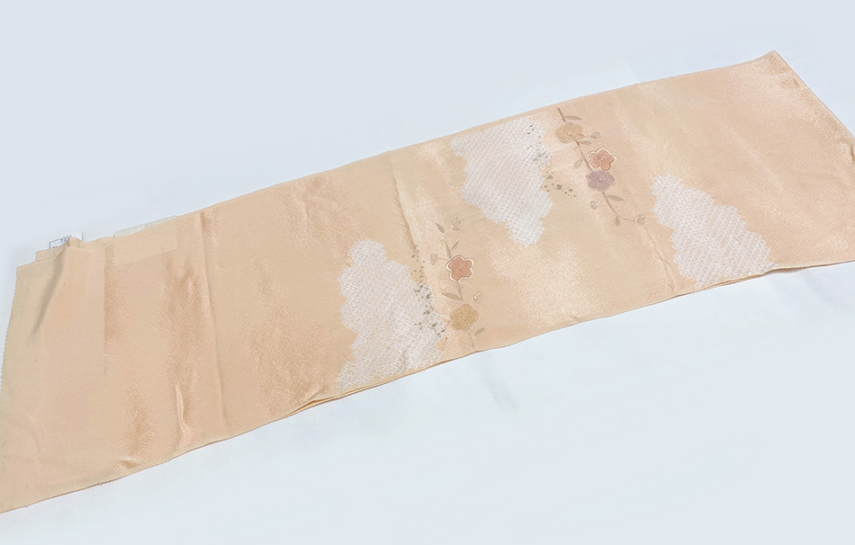 スベリの良い手触りの光沢のある雲の地柄を織り込んだ紋綸子の生地をサーモンピンク色に地染めし、雲柄を白の絞りで染め、梅の柄を生藤色や濃いめ地色などに、共色のスワトウ刺繍や少しの相良刺繍などを加え仕上げた品。
