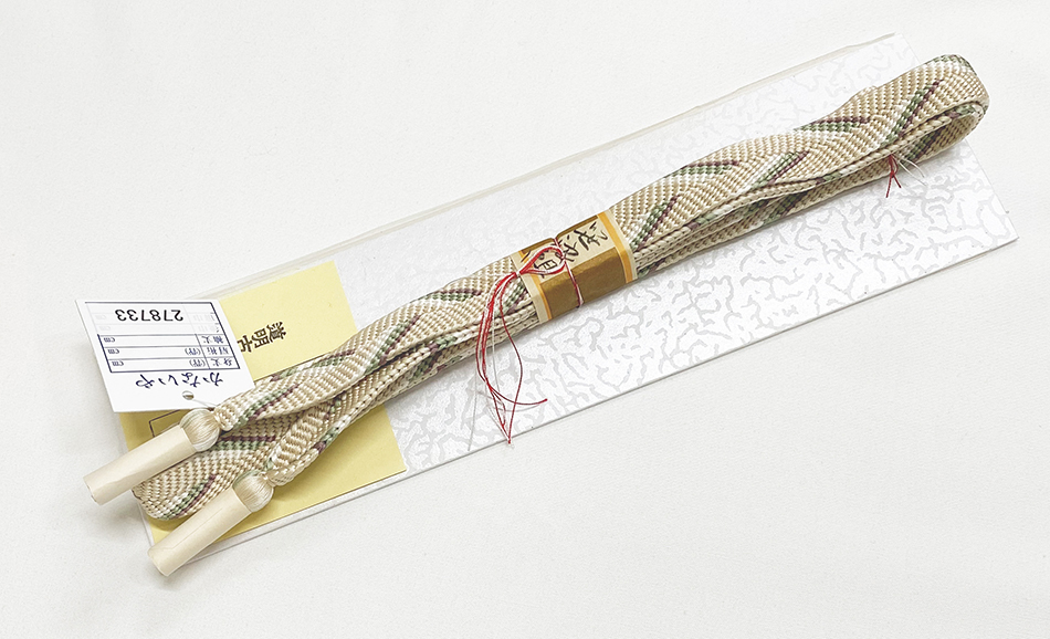 白茶色の笹波組みで、斜線柄を藤ネズやくすんだ青磁色・白で組み上げた品。道明謹製、箱入り。