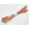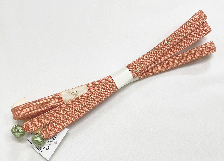サーモン色の内記組みで、小さな線柄をくすんだ青磁色で組み上げた品。両端に組み紐玉が付いています。