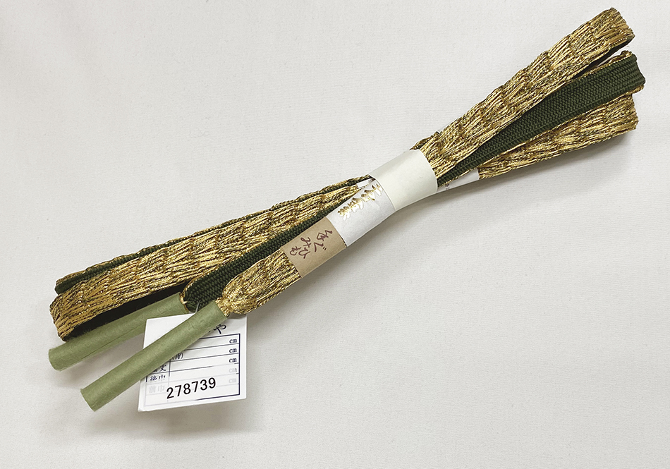 オリーブグリーン色の高麗組みの上に、三分金糸(さんぶきんし)の変わり組みを重ねた品。