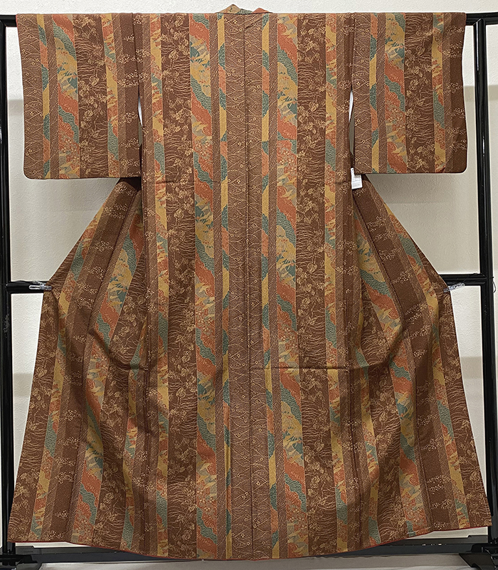 確りとした張りのある手触りのポリエステル無地意匠の生地をくすんだ海老茶色に地染めし、細縞と花や鳥などの柄を地色や黄赤色・青色・金茶色などで重ね染めした品。八掛けはポリエステルエンジ色無地で胴裏もポリエステルが付いています。衿裏にはホック代わりに糸が付いています。ミシン縫い仕立て。
