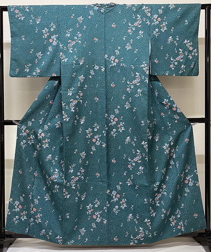 しなやかな手触りで小さなフクレ織りを織り込んだポリエステル紋意匠の生地をアラレ柄をベージュ色で重ねたくすんだ緑色に地染めし、花柄を薄紫色や金茶色・黄赤色などで重ね染めした品。八掛けはポリエステルくすんだ裏葉色無地で胴裏は上質なポリエステルが付いています。手縫い仕立て。