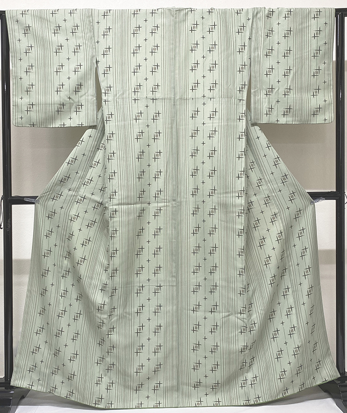 薄手のしなやかな手触りで霜降りの地柄を織り込んだポリエステル紋意匠の生地をやわらかな薄黄緑色に地染めし、細縞や絣柄をエンジ色や墨色などで重ね染めした品。八掛けはポリエステルくすんだ緑色無地で胴裏もポリエステルが付いています。ミシン縫い仕立て。