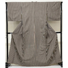確りとした張りのある手触りで小さな凹凸のあるポリエステル一越の生地をくすんだベージュ色に地染めし、縞柄を黒や茶色などで重ね染めした品。八掛けはポリエステル金茶色無地で胴裏もポリエステルが付いています。衿裏にはホック代わりに糸が付いています。ミシン縫い仕立て。