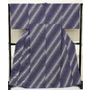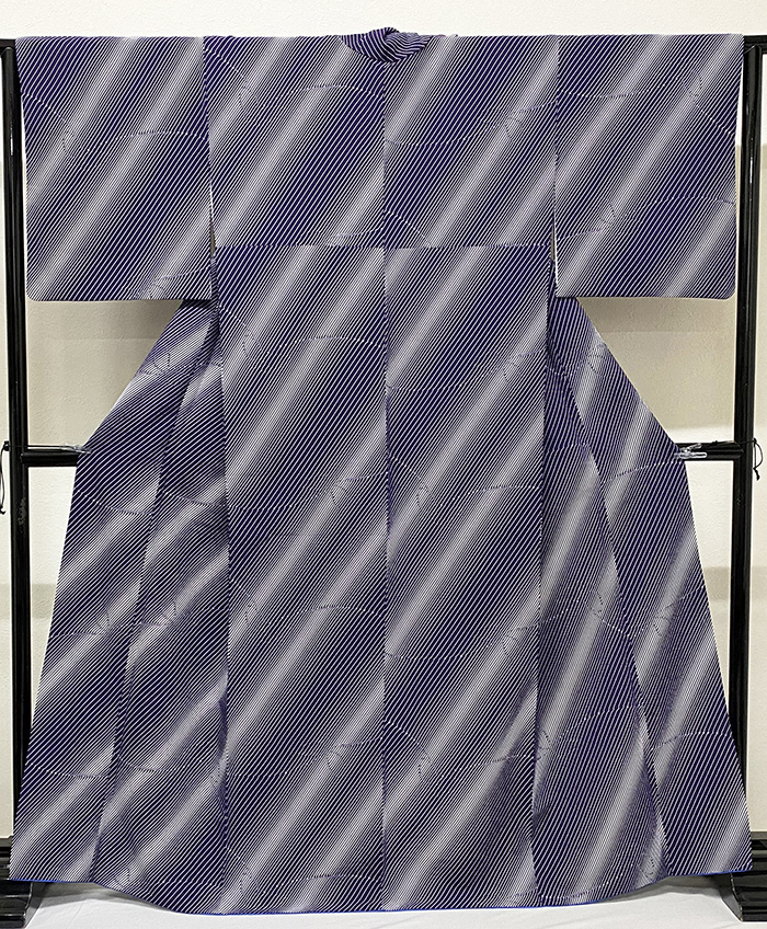確りとした張りのある手触りで小さな凹凸のあるポリエステル無地意匠の生地に、斜線柄と蝶の柄を黒に近い紫色と黒などで重ね染めした品。八掛けはポリエステル鮮やかな青色暈し無地で胴裏もポリエステルが付いています。衿裏にはホック代わりに糸が付いています。ミシン縫い仕立て。