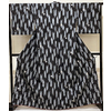 薄手でスベリの良い手触りのポリエステル無地意匠の生地を黒に地染めし、矢羽根の柄をグレーで染め、四角取り花柄を白や金茶色・薄ネズ色などで重ね染めした品。八掛けはポリエステルエンジ色無地で胴裏もポリエステルが付いています。ミシン縫い仕立て。