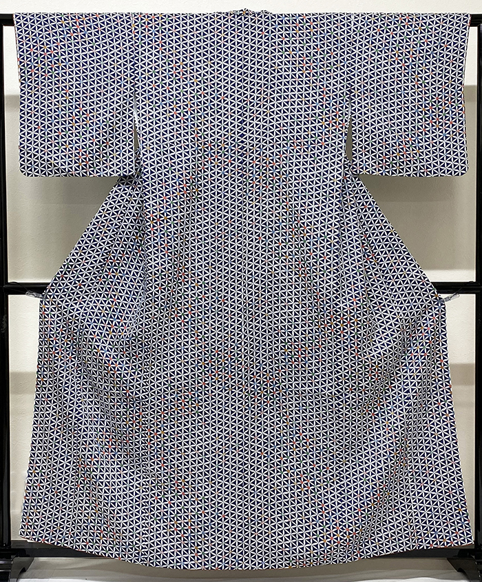 しなやかなスベリの良い手触りのポリエステル無地意匠の生地を紺色に地染めし、七宝崩しや小花の柄を緑色や青色・金茶色・赤色などで重ね染めした品。八掛けはポリエステル黄赤色暈しで胴裏もポリエステルが付いています。手縫い仕立て。