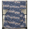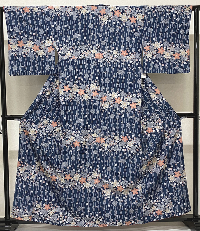薄手で確りとした張りのある手触りで小さな霜降りの地柄を織り込んだポリエステル紋意匠の生地を暗い紺色に地染めし、ヨロケ縞と花などの柄を白ネズ色や薄紫色・黄赤色・青色・少しの金彩などで重ね染めした品。八掛けはポリエステルエンジ色無地で胴裏もポリエステルが付いています。衿裏にはホック代わりに糸が付いています。ミシン縫い仕立て。
