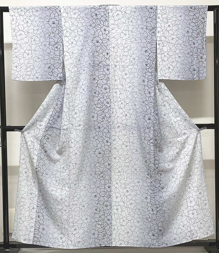 しなやかな良い手触りのポリエステル一越の生地を白とグレー色の縦暈しに地染めし、椿の花柄を黒に少しの黄赤色を加え重ね染めした品。背伏せは別生地が付き、ポリエステル白の衿裏が付いたミシン縫いの単衣仕立て。
