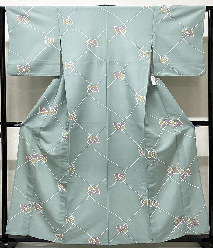 確りとした張りのある手触りのポリエステル無地意匠の生地をやわらかな青磁色に地染めし、幾何学の柄を白や金茶色・赤紫色などで重ね染めした品。背伏せは共生地返しでポリエステル白の衿裏が付いたミシン縫いの単衣仕立て。