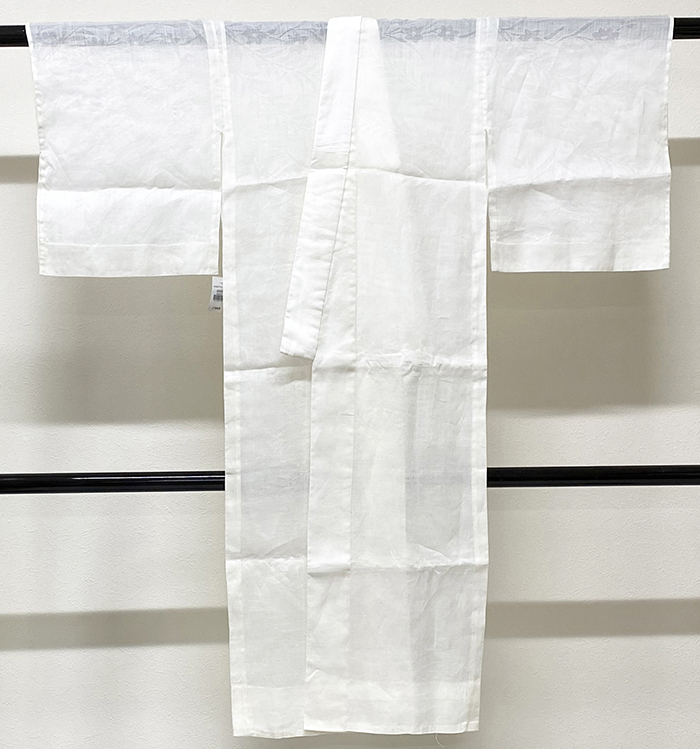 しなやかな張りのある手触りの花葉柄を織り込んだ本麻の生地の白襦袢。背伏せは共生地返しの単衣仕立てで。手縫い仕立て。