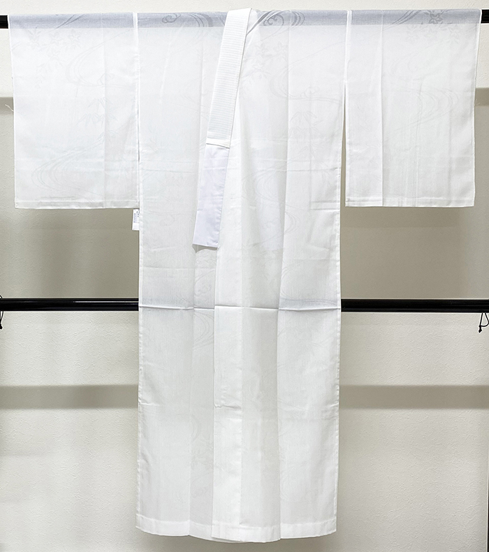 しなやかな張りのある手触りの流水と花の地柄を織り込んだポリエステルと麻の交織の紋紗生地の白襦袢。背伏せは共生地返しの単衣仕立てで、ポリエステル白絽の半衿が付いています。手縫い仕立て。