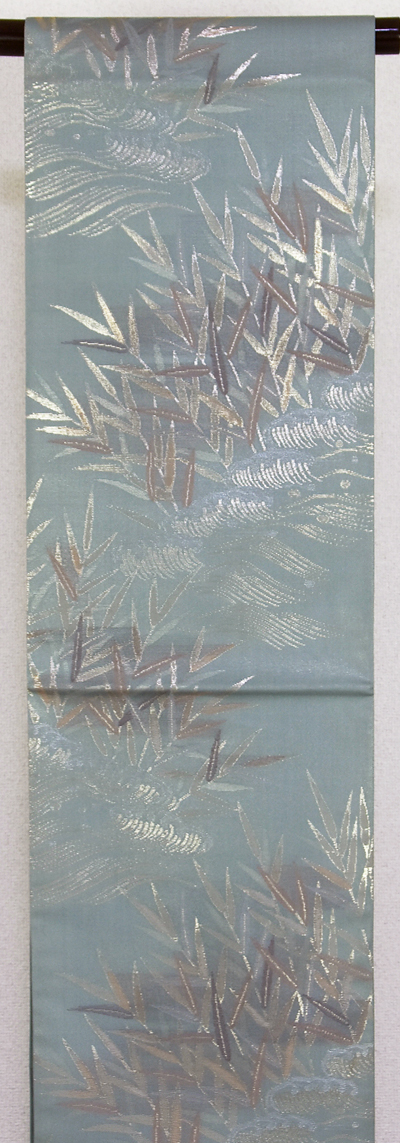 シャリ感のある手触りの薄い青ネズに銀の引き箔を重ねた紗織り地織りに、波頭に枝葉の柄を退紅色や薄紫などに銀糸を加え重ね織りした品。