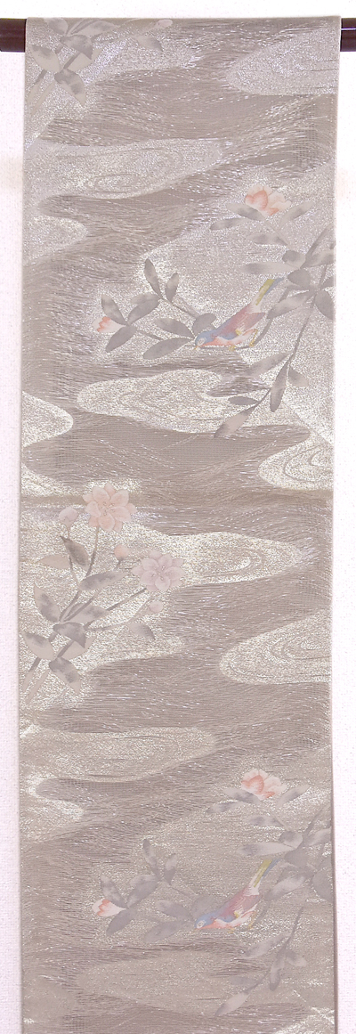 シャリ感のある手触りの白ネズ絽織り地織りに、枝花と鳥の柄を水色や鶸(ひわ)色、珊瑚色などに金銀糸を加え重ね織りした品。