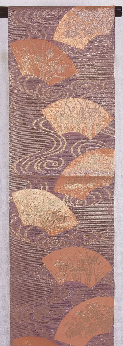 シャリ感のある手触りの茶色みの紫絽織り地織りに、流水に扇面取り枝花の柄を薄い赤茶や金の引き箔を加え重ね織りした品。