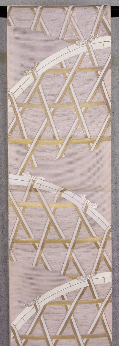 張りのある手触りの赤みの生成り絽織り地織りに、大きな光悦垣の柄を生成りと金銀糸で重ね織りした品。