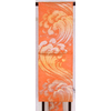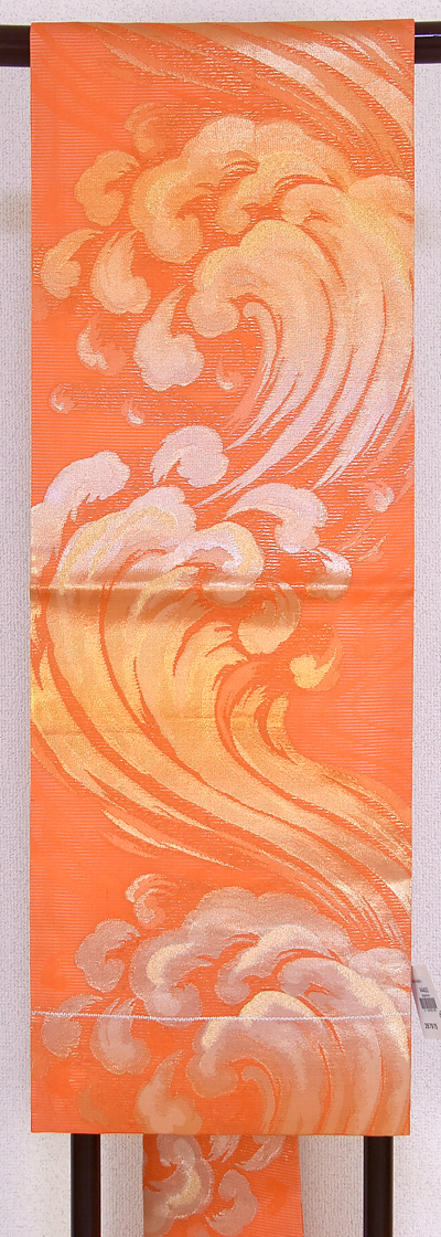 シャリ感のある手触りの明るいオレンジ色絽織りの地織りに、波頭の柄を金銀濃淡の引き箔で重ね織りした品。