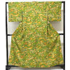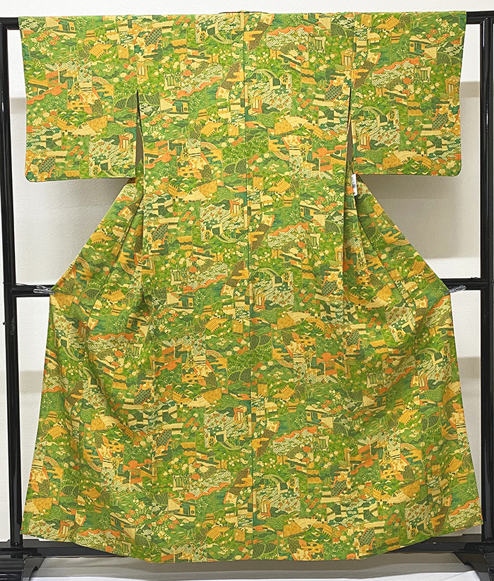 しなやかな手触りのポリエステル無地意匠の生地を薄緑色に地染めし、御所車や家・花などの柄を金茶色・黄赤色などで重ね染めした品。背伏せは別生地が付き、ポリエステル白の衿裏が付いたミシン縫いの単衣仕立て。