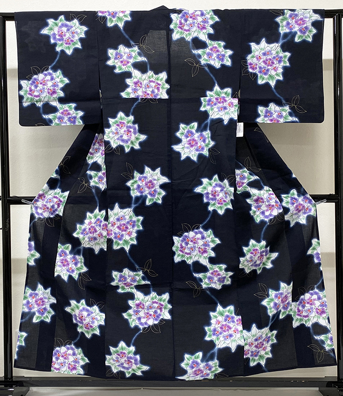 確りとした手触りの木綿の生地を黒に近い紺色に地染めし、紫陽花の柄を白と薄紫色・緑色・少しの金彩などで重ね染めした品。お尻部分に共生地の居敷当てが付いた単衣仕立て。ミシン縫い仕立て。