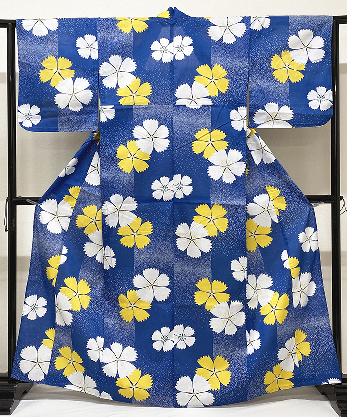しなやかな手触りの綿紅梅の生地をハナダ色に地染めし、撫子とアラレの柄を白と黄色で重ね染めした品。背伏せは共生地返しで単衣仕立て。ミシン縫い仕立て。