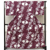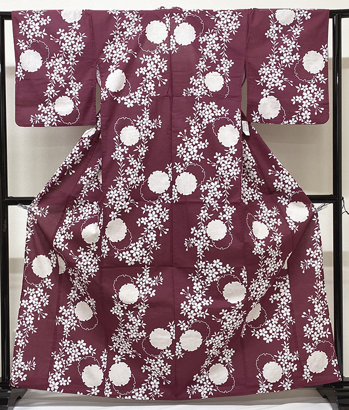 しなやかな手触りの木綿の生地を小豆色に近い赤紫色に地染めし、雪輪と枝垂れ桜の柄を白とベージュ色などで重ね染めした品。背伏せは共生地返しで単衣仕立て。ミシン縫い仕立て。