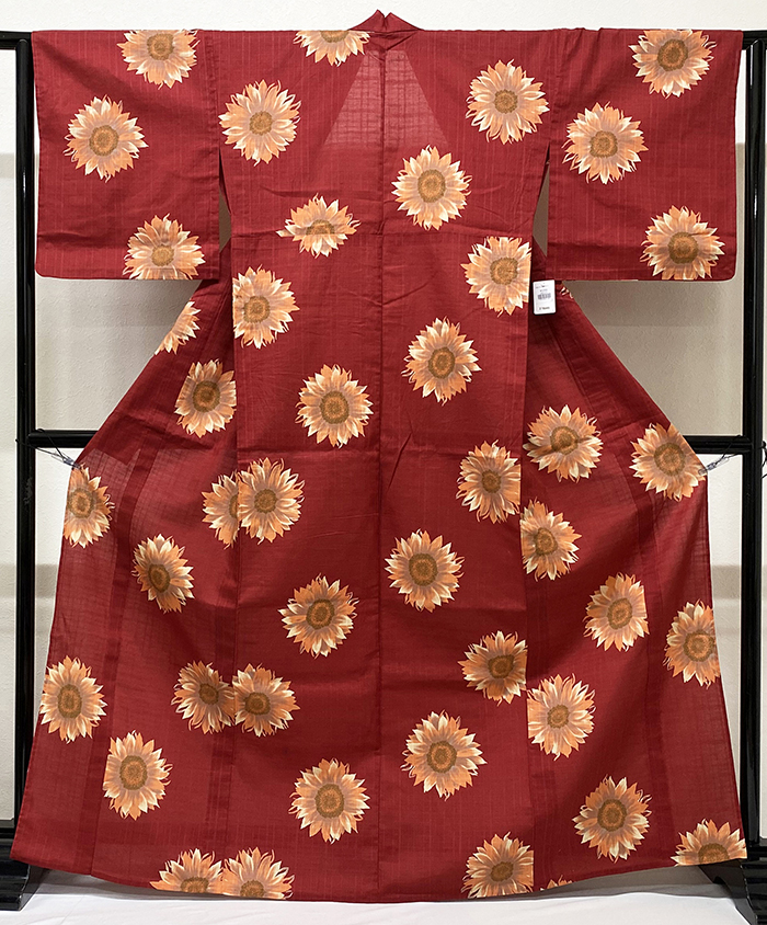 しなやかな手触りの小さな格子の地柄を織り込んだ木綿90% 麻10%の交織生地を紫寄りのエンジ色に地染めし、ヒマワリの柄を白と薄オレンジ色・ウグイス色などで重ね染めした品。背伏せは共生地返しで単衣仕立て。ミシン縫い仕立て。