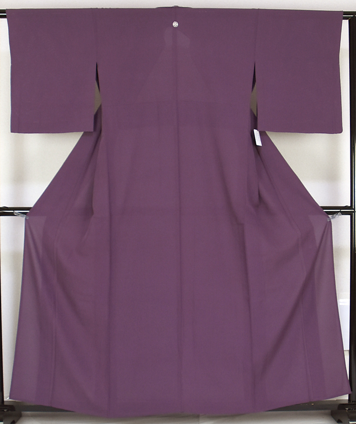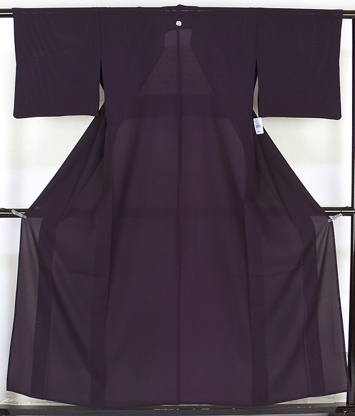 シャリ感のある手触りの良質な重め絽織りの生地を暗め京紫無地で染め上げた品。背伏せは共生地返しで、正絹白絽の衿裏が付いた手縫いの単衣仕立て。