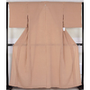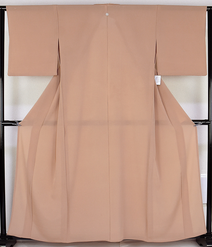 シャリ感のある手触りの良質な絽縮緬の生地を赤みの白茶無地で染め上げた品。背伏せは別生地が付き、正絹白の衿裏が付いた手縫いの単衣仕立て。