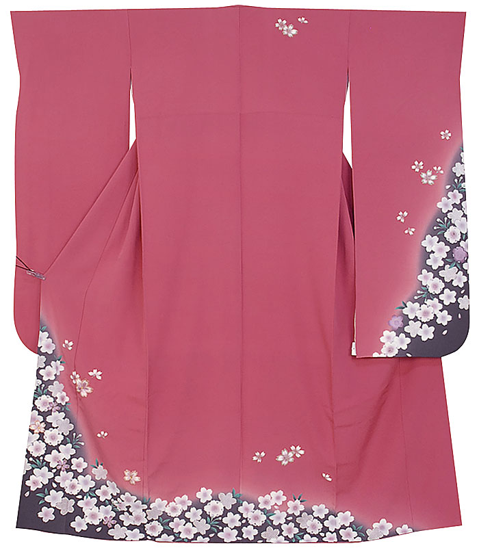 しなやかな手触りで確りと打ち込まれた古代縮緬の生地をくすんだツツジ色に地染めし、上前裾のチャコールグレー斜め暈しの上に桜の花柄を薄藤や納戸色、生成りのなどの色糸刺繍を加え可愛く仕上げた品。八掛けは正絹表色無地で胴裏はポリエステルが付いた手縫い仕立て。衿裏にはくるみホックが付いています。