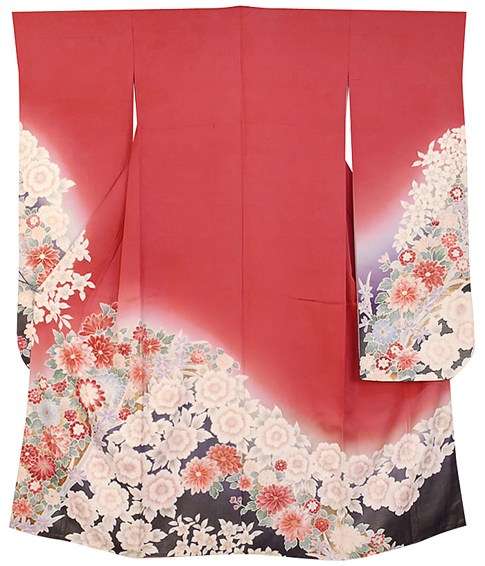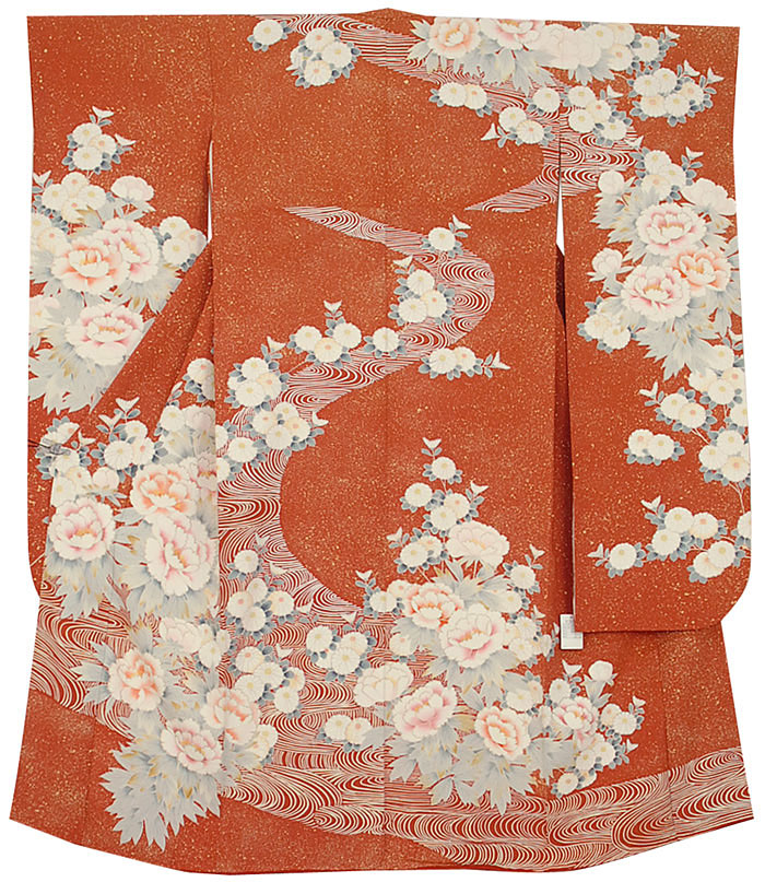 しなやかな手触りで確りと打ち込まれた重め一越の生地を丹色に砥粉(とのこ)色のロウ吹雪を重ねて地染めし、上前からの流水の上に大きな花柄を珊瑚色や曙色、薄い青ネズ濃淡暈しに生成りと金彩を加えた手描き友禅で丁寧に重ね染めした品。八掛けは正絹表色暈しが付き胴裏は正絹が付いた手縫い仕立て。