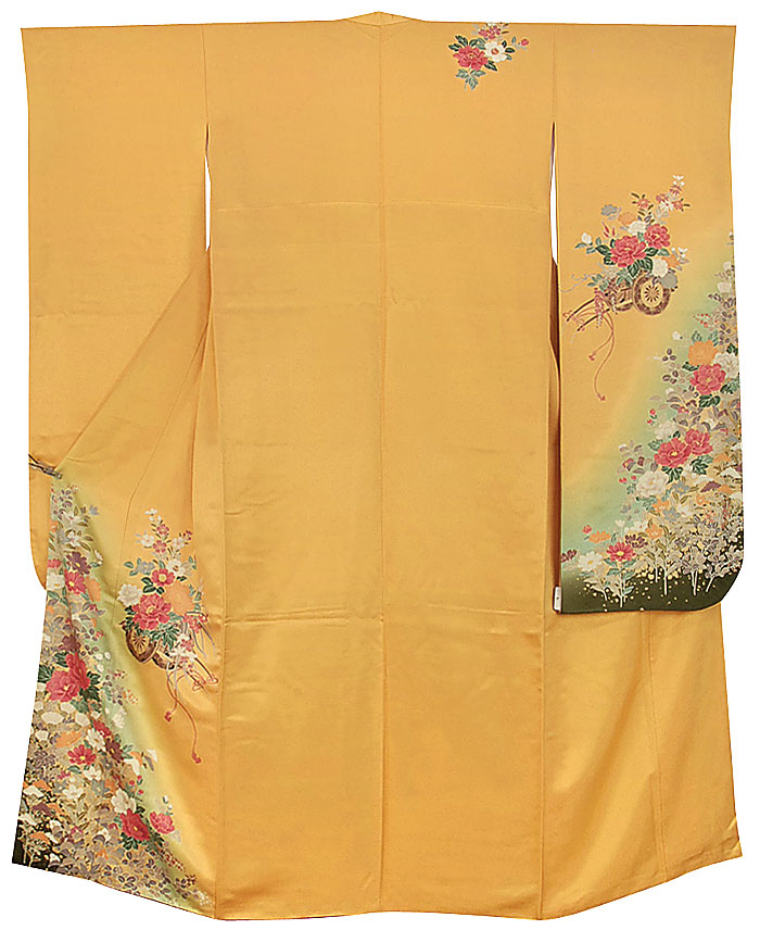 スベリの良い手触りで光沢のある真砂の地柄を織り込んだ重め紋意匠の生地を山吹色に地染めし、上前からの花車の柄をくれない色やモスグリーン、金茶などに金彩友禅を加え重ね染めした品。八掛けは正絹エンジ無地で胴裏はポリエステルが付いた手縫い仕立て。