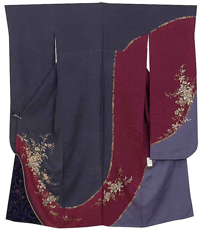 スベリの良い手触りで光沢のある花柄をフクレ織りで重ねた変わり紋意匠の生地をくすんだチャコールグレーと蘇芳色染め分け暈しに地染めし、上前からの斜め取り蔓花のビロードにラメを重ねた布地をパッチワークで重ね蔓花の柄を裏葉色や今様色などの色箔糸に金糸刺繍を加え豪華に仕上げた品。八掛けは正絹表色無地で胴裏はポリエステルの品が付いた手縫い仕立て。