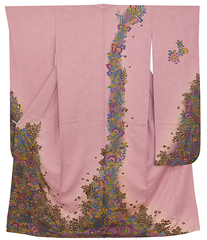 スベリの良い手触りで光沢のある小さな辻ヶ花の地柄をフクレ織りと金通しを重ねた紋意匠の生地を退紅色に地染めし、上前からの小花重ねの柄をこげ茶や金茶、納戸色などに青紫を加えモダンに仕上げた品。八掛けは正絹表色無地でオクミ裏に柄を置き胴裏は正絹が付いた手縫い仕立て。衿裏にはくるみホックが付いています。