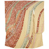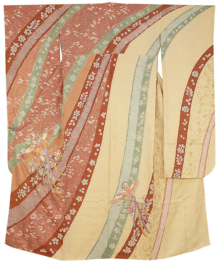 スベリの良い手触りで光沢のある花サヤガタの地柄を織り込んだ重め紋意匠の生地をくすんだ黄色に地染めし、上前からの束ね熨斗の今様色・退紅色の桶絞りの上に、枝花や鳳凰などの柄を青緑・珊瑚色・藤ネズなどの色金彩友禅と色糸に金糸を加えた手刺繍などで豪華に重ね染めした品。八掛けは正絹表色無地でオクミ裏に柄を置き胴裏は正絹が付いた手縫い仕立て。