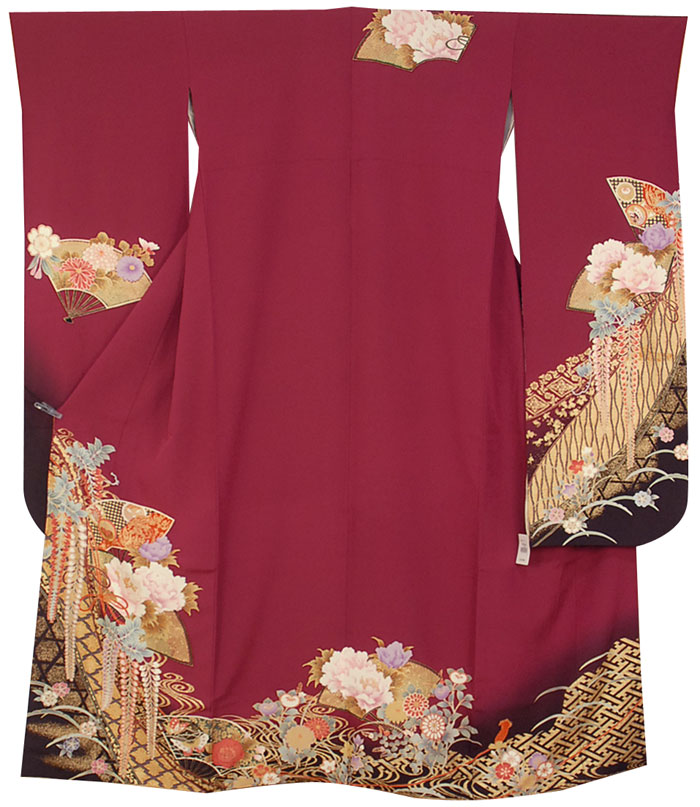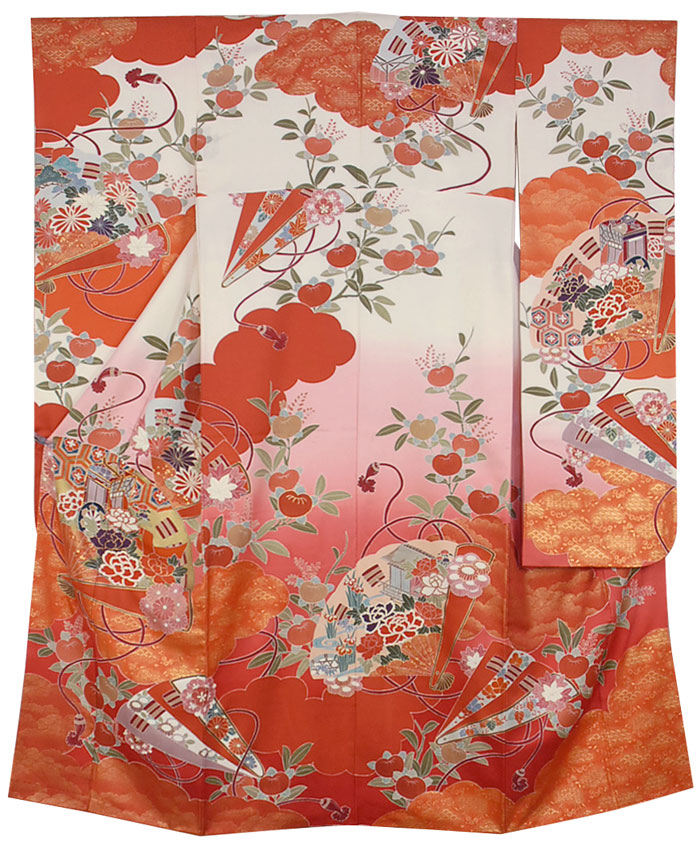 スベリの良い手触りで光沢のあるサヤガタの地柄を織り込んだ紋緞子の生地を生成りに地染めし、上前からの丹色・珊瑚色の斜め暈しの上に、扇面と雲取り重ねに御所車や花などの柄を蘇芳色・地色濃淡に薄藤などの金彩友禅に金糸刺繍を加え豪華に重ね染めした品。八掛けは正絹表色無地でオクミ裏から裾に柄を置き胴裏は正絹が付いた手縫い仕立て。衿裏にはくるみホックが付いています。