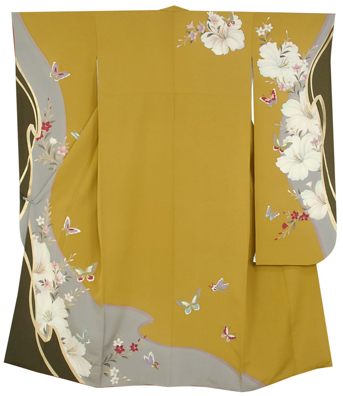 しなやかな手触りで確りと打ち込まれた古代縮緬の生地を油色に地染めし、上前からのオリーブグリーン・銀ネズの斜め染め分けの上に、洋花と蝶の柄を生成り・くすんだ黄緑色・薄藤などに金彩を加えモダンに重ね染めした品。八掛けは正絹紅色無地で胴裏は正絹が付いた手縫い仕立て。衿裏にはホックも糸も付いていません。